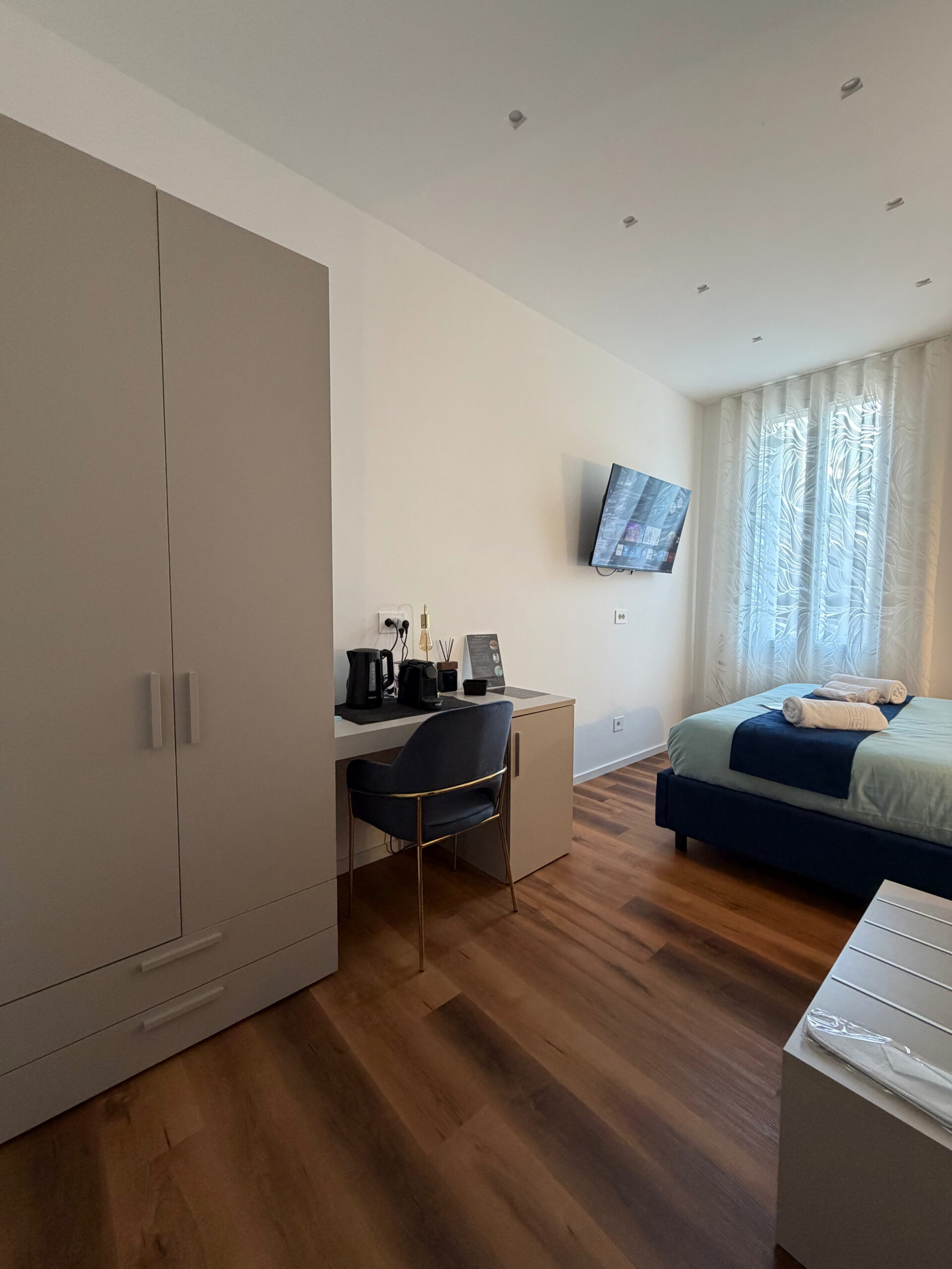 Compatta ed essenziale, ma ricca di charme: Dupion è la camera più raccolta di The Silk Rooms, progettata in armonia con lo stile della struttura e ideale per chi cerca una camera nel centro di Reggio Calabria curata, accogliente e contemporanea.